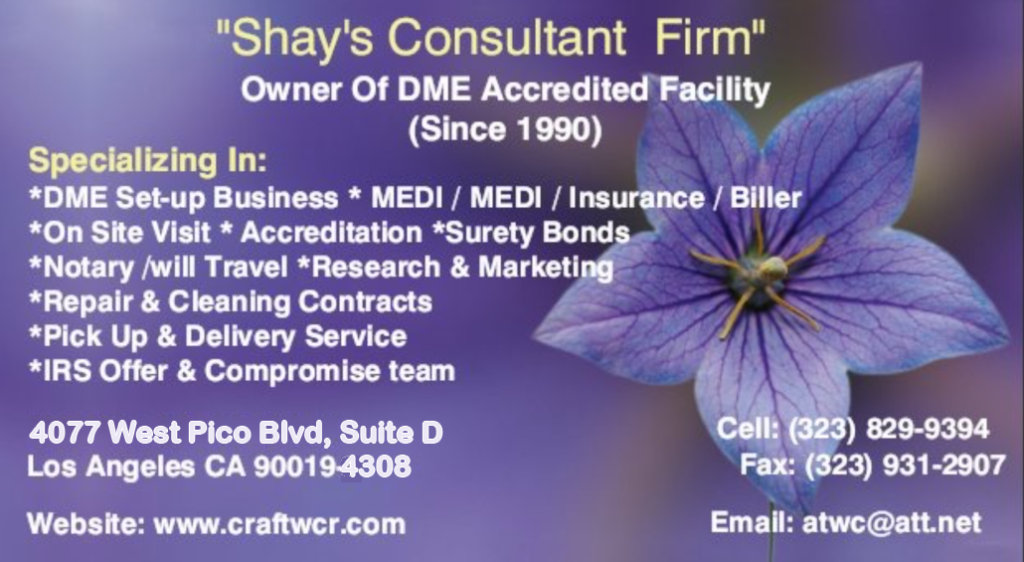 Shay’s consultant firm has intense experience in all aspect of DME policies, regulations and procedures.We are trained to keep all companies in compliance to ensure they stay up to code with all of the rules that apply to any DME facility.
